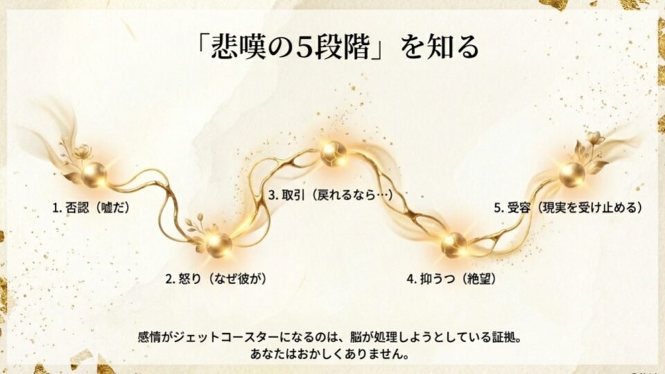 スイスの精神科医、エリザベス・キューブラー=ロスが提唱した「悲嘆の5段階モデル」を知っていますか。彼女は『死ぬ瞬間』という著書の中で、大きな喪失を経験した人間は5つのプロセスを辿ると述べています。