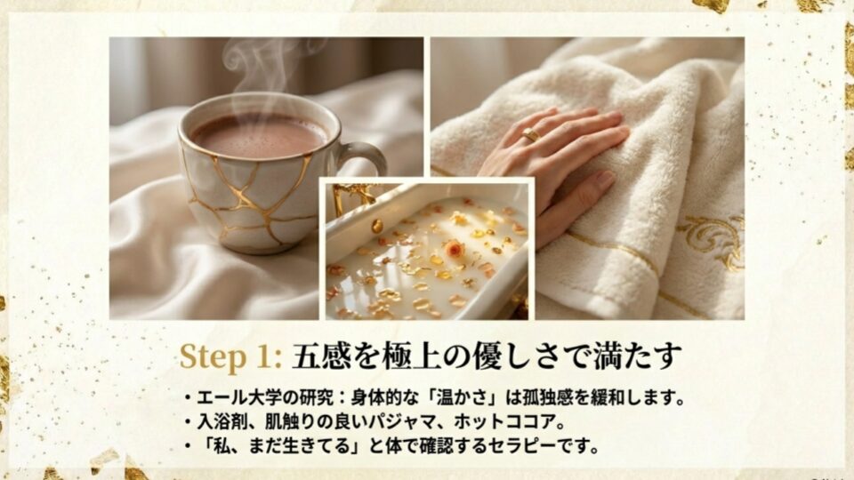 心が「死」を感じている時、五感を刺激して「私、まだ生きてるな」と確認することは、最も原始的で確実なセラピーになります。エール大学の研究によれば、身体的に「温かさ」を感じることで、心理的な孤独感や冷たさが緩和されることが示唆されています。今夜は、湯たんぽを抱きしめて寝るのもおすすめです。