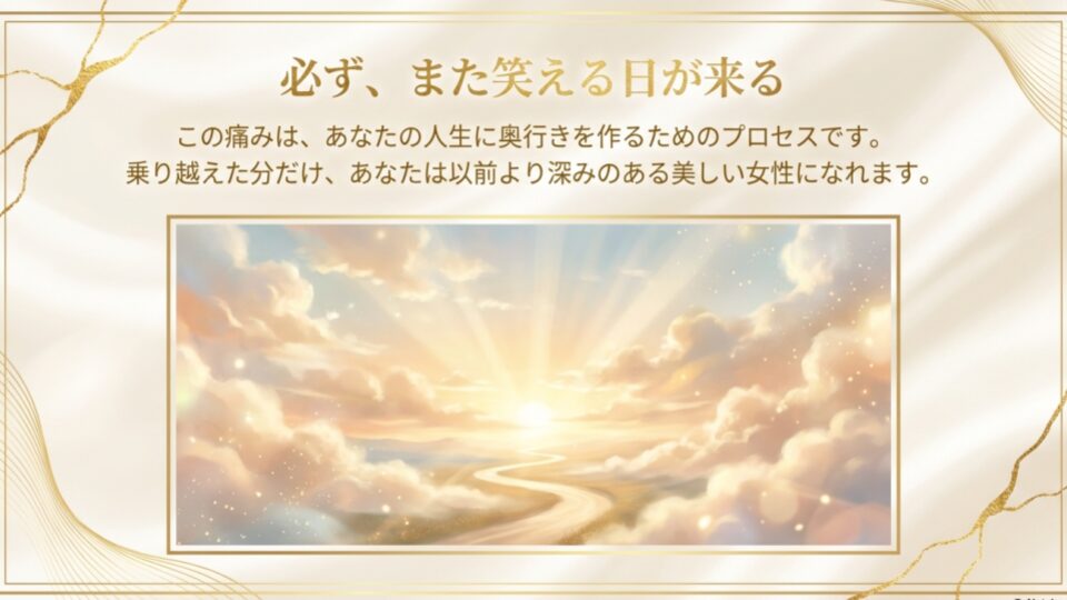 かつて、あなたが彼を愛したその情熱は、いつか必ず別の形、あるいは別の誰かとの幸せに昇華されます。失恋は、あなたの人生に奥行きを作るための「グリーフ(悲嘆)」のプロセス。それは決して無駄な時間ではありません。痛みを乗り越えた分だけ、あなたはこれまで以上に深みのある、美しい女性になれるはずです。