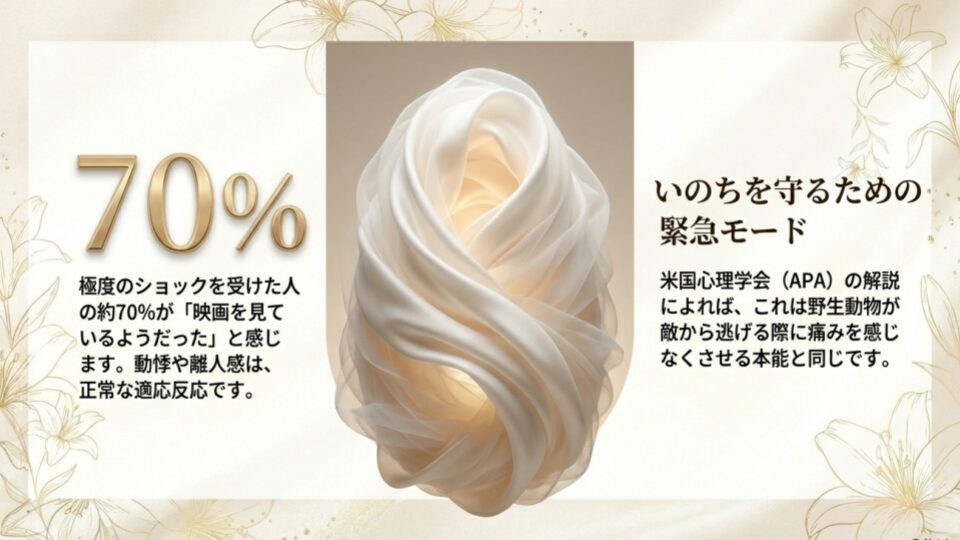 これは野生動物が敵に襲われた際、痛みを感じにくくして逃げ延びようとする生存本能に近いもの。1990年代に行われた心理学的調査でも、極度のショックを受けた被験者の約70%が「現実味がなく、映画を見ているようだった」と回答しています。