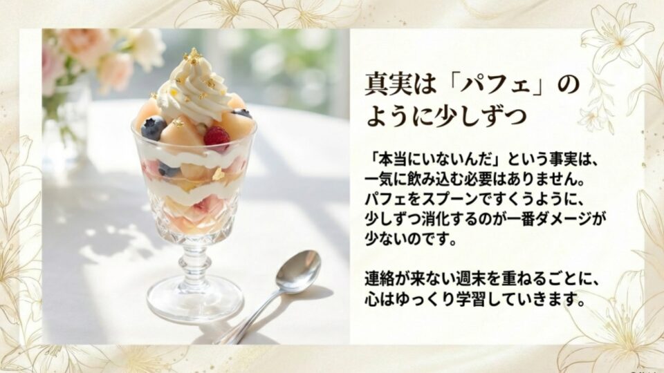 1週間、2週間と時間が経ち、週末を一人で過ごす経験を繰り返すうちに、心は少しずつ学習していきます。「ああ、本当にいないんだな」という事実は、一気に受け入れるのではなく、パフェをスプーンですくうように、少しずつ消化していくのが一番ダメージが少ないのです。