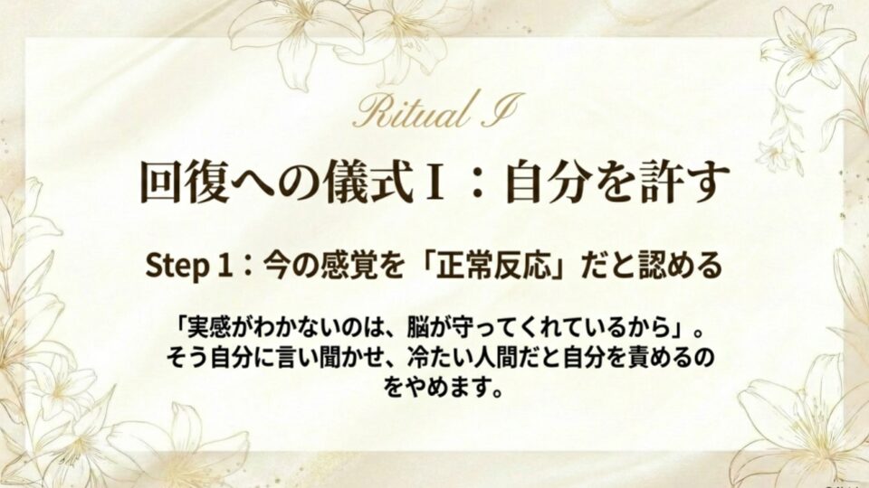 まずは「実感がわかないのは、脳が自分を守ってくれているからだ」と自分に言い聞かせてください。冷たい人間だと自分を責めるのをやめる。これがすべての始まりです。