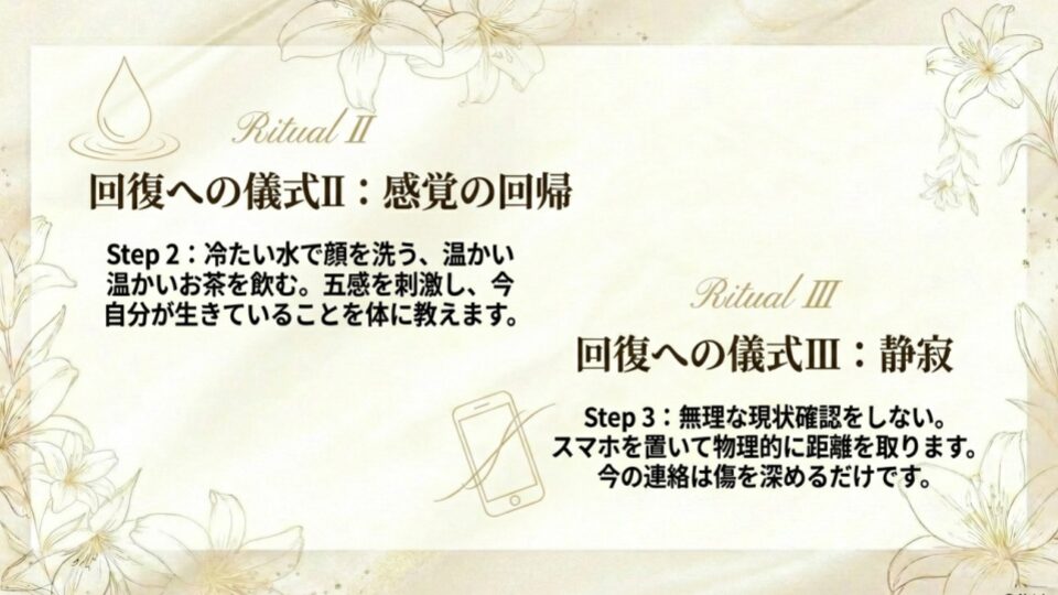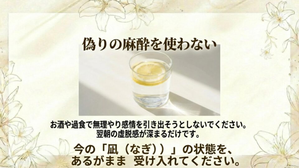 お酒で無理やり泣いたり、暴飲暴食で気を紛らわせたりしても、翌朝にはさらに深い虚脱感が襲ってきます。今の「凪(なぎ)」の状態を、そのまま受け入れてあげてください。