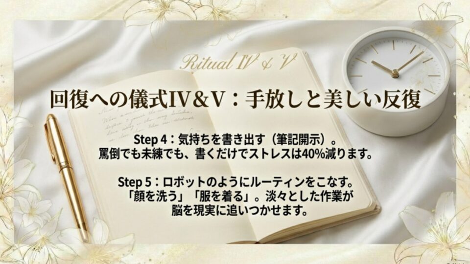 ノートでもスマホのメモでも構いません。意味不明な罵倒や、「まだ好き」という矛盾した気持ちをすべて書き出します。心理学で「筆記開示」と呼ばれるこの手法は、書き出すだけでストレスが40%軽減されるという研究結果もあります。