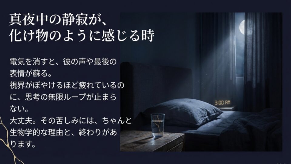 これは、心に負った大きな傷を脳が必死に処理しようとしている証拠。しかし、深夜の脳は極めてネガティブに傾きやすいため、答えの出ない迷路を彷徨うことになります。まるで、結末を知っている悲劇の映画を、映画館の支配人に無理やり最前列で見せられ続けているような状態。リモコンは、まだあなたの手元にはありません(誰かそのリモコンをメルカリにでも出してほしいですよね)。