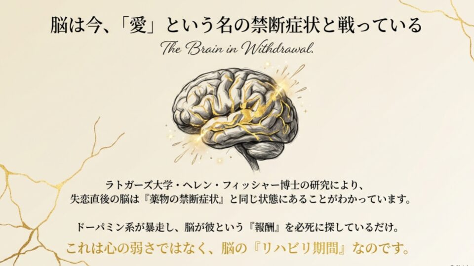 彼という「報酬」を失ったことで、ドパミン系が暴走し、脳は飢餓状態に。必死に彼を探そうとして覚醒状態が続いてしまうのです。今のあなたは、いわば「脳が激しいリハビリ中」の状態。眠れないのは、生物学的に見て「仕方のない事故」のようなものです。