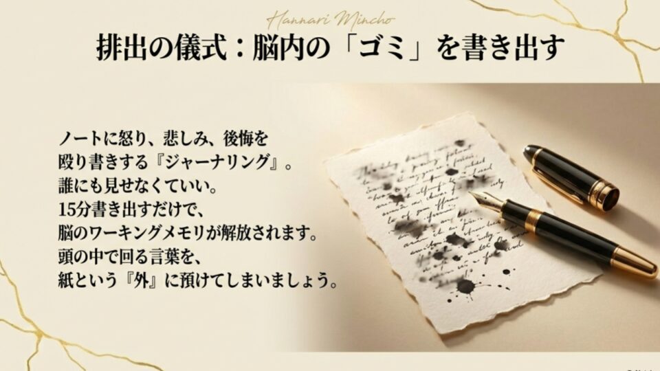 ノートでも裏紙でも構いません。彼への怒り、悲しみ、自分へのダメ出しを、誰にも見せない前提で殴り書きしてください。「筆記開示(ジャーナリング)」という手法で、これを15分ほど行うだけで、脳のワーキングメモリが解放され、心理的なストレスが大幅に軽減されることが研究で証明されています。