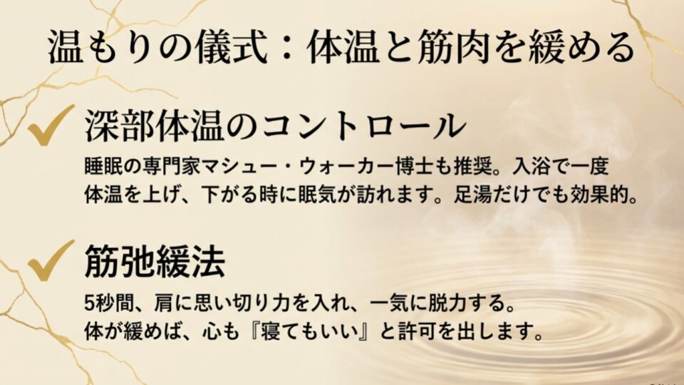 これを数回繰り返すだけで、体はリラックスモードに切り替わります。心と体はつながっています。体が緩めば、心も少しだけ「今は寝てもいいかも」と許してくれるはずです。