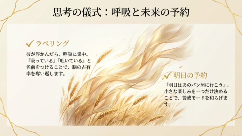 目を閉じても彼が浮かぶなら、自分の呼吸に集中しましょう。鼻を通る空気の温度、肺が膨らむ感覚。「吸っている」「吐いている」と心の中でラベルを貼ることで、反芻思考に割く脳の占有率を奪います。