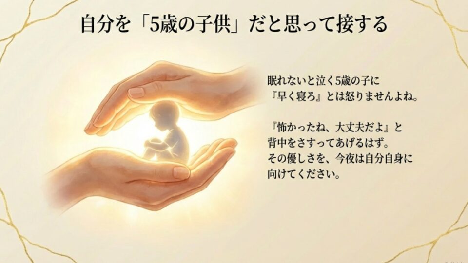 「早く寝なよ!」「終わった人のことなんて考えるな!」なんて怒鳴りませんよね。きっと「大丈夫だよ、怖かったね。隣にいるよ」と背中をさすってあげるはず。今のあなたにも、その優しさを向けてあげてください。自分を責めるのをやめて、「そりゃ悲しいよね、眠れないよね」と甘やかしていい。それだけで、副交感神経が優位になり、少しだけ呼吸が深くなります。