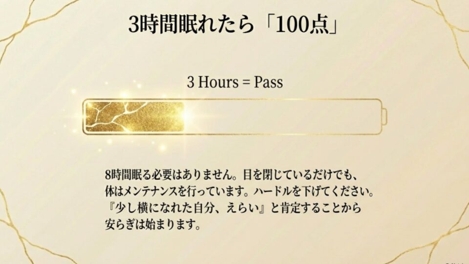 今の状況で、たとえ数時間でも、あるいは目を閉じているだけでも、あなたの体は最低限のメンテナンスを行っています。眠れなかったことを責めず、「少しだけでも横になれた自分、偉い」と。それくらいの低いハードルで、自分を肯定してあげてください。