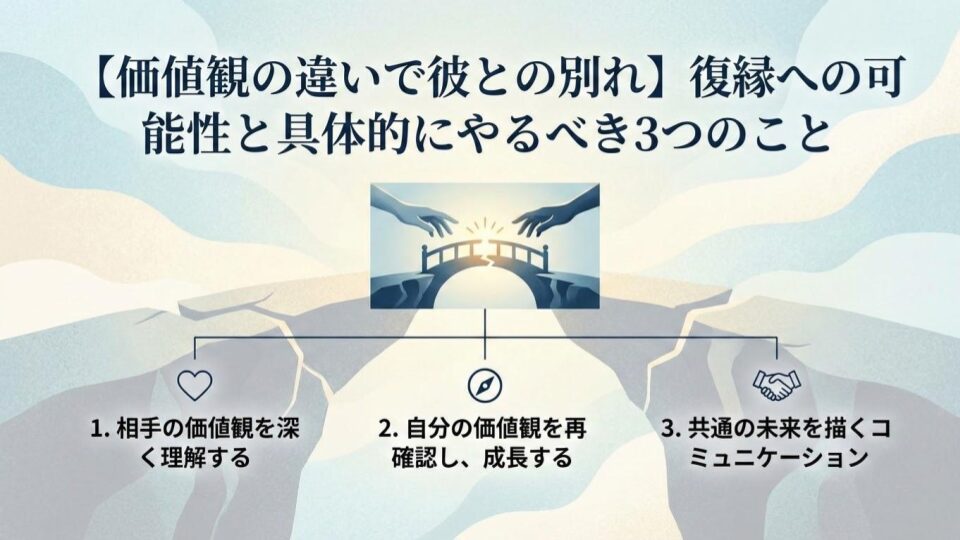 復縁の鍵は、「どうやって相手を説得するか」ではなく、「どうやって違いを許容できる自分になるか」にあります。あなたが「あ、そういう考え方もあるんだね」と柔らかく笑えるようになったとき、彼は「もう一度、この人と向き合ってみたいな」と思い始めます。