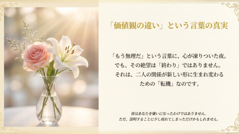 今は、胸に穴が空いたような感覚かもしれません。でも、大丈夫。「価値観の違い」という言葉は、実はとても便利な逃げ道として使われることが多いのです。本当の理由は、価値観そのものではなく、その「伝え方」にあっただけかもしれません。焦らなくていい。ゆっくり紐解いていきましょう。