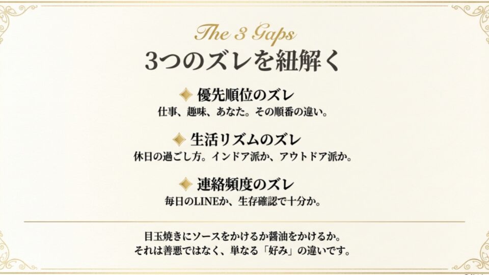 「価値観」という大きな言葉を分解すると、実は以下の3つのズレに集約されます。