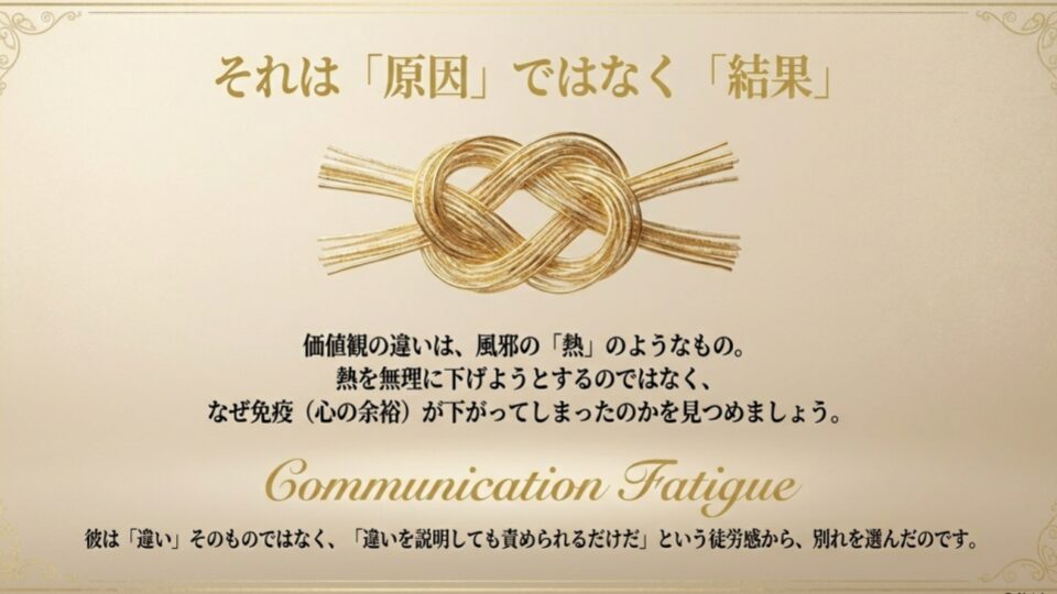 厳しいことを言いますが、「価値観が違う」のは別れの本質的な原因ではありません。それは「二人の対話が機能しなくなった結果」として現れた最終的な症状に過ぎないのです。