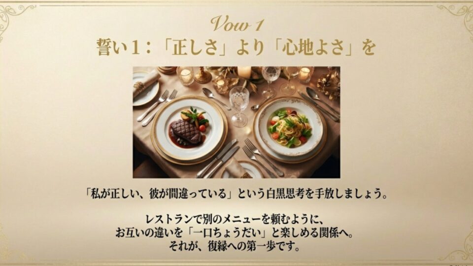 例えば、彼が趣味に大金をつぎ込むことに、あなたは「将来設計がない」と怒ったかもしれません。でも、彼にとってはそれが「明日への活力」だった。ここで「将来のために貯金すべき」という正論をぶつけると、彼は心を閉ざします。「味覚が違う」からといって、一緒にレストランに行けないわけではありませんよね。お互いに別のメニューを頼んで、「一口ちょうだい」と言い合える関係。そんな余裕が、復縁には絶対に必要なのです。