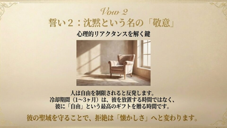 心理学では「心理的リアクタンス」と呼ばれますが、人は自由を制限されると猛烈に反発したくなる生き物です(「宿題しなさい」と言われるとやる気が失せる、あの現象ですね)。今は彼を自由にさせてあげてください。彼が「自分の価値観を否定されない」と確信したとき、初めて再会のチャンスが訪れます。沈黙こそが最大の武器になります。