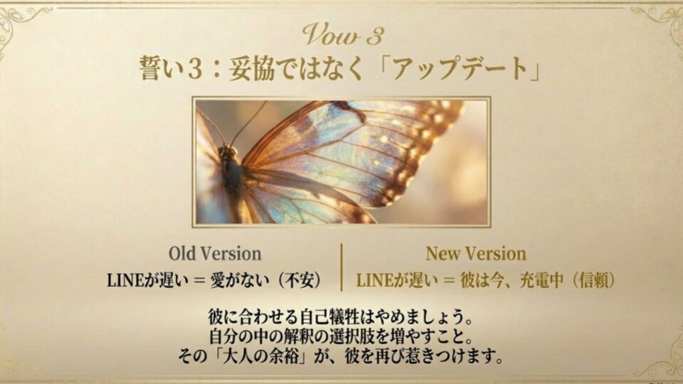 「LINEが遅いのは、私への愛が冷めた証拠だ」という古い価値観を、「彼は今、自分の世界に没頭してリフレッシュしているんだな」という新しい解釈にアップデートすること。このしなやかさこそが、彼が再び戻ってきたくなる「大人の余裕」に直結します。