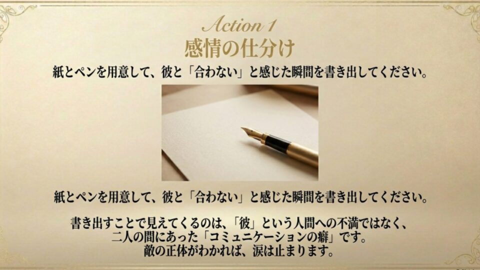 書き出してみると、意外と「共通の敵」が見えてきます。それは彼という人間そのものではなく、二人の間に横たわっていた「コミュニケーションの癖」です。客観視するだけで、止まらなかった涙が少しだけ落ち着くはずです。