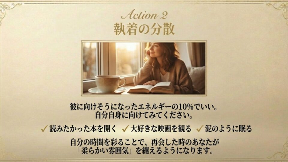 あなたが大好きな映画を観る、読みたかった本を開く、あるいは泥のように眠る。彼に向けそうになったエネルギーの10%でもいいから、自分自身に向けてみてください。再会したときに「なんだか雰囲気が柔らかくなったね」と言われる準備は、今この瞬間から始まっています。