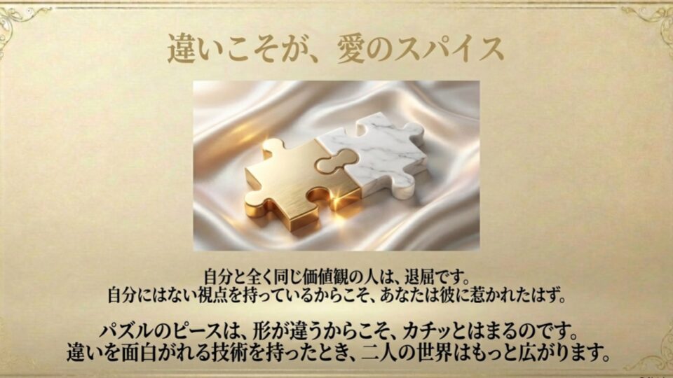 もし、あなたと全く同じ価値観の男性がいたら、それはそれで猛烈に退屈かもしれません。自分にはない視点を持っているからこそ、あなたは彼に惹かれたのではないでしょうか。パズルのピースは、形が違うからこそ、カチッとはまるのです。同じ形のピースは、一生隣り合うことはできません。