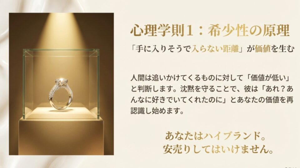 これを心理学では「希少性の原理」と呼びます。別れた直後にあなたが沈黙を守ることで、彼は「あれ?あんなに好きでいてくれたのに、連絡がないな」と、あなとの価値を再認識し始めるのです。
