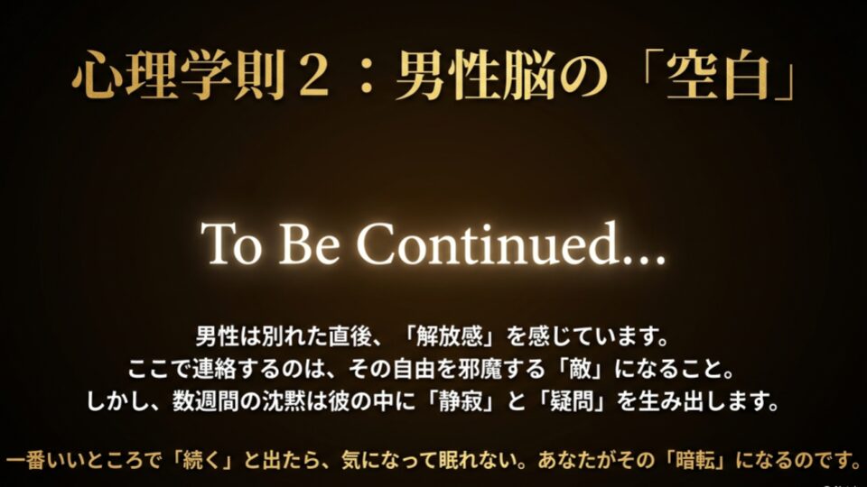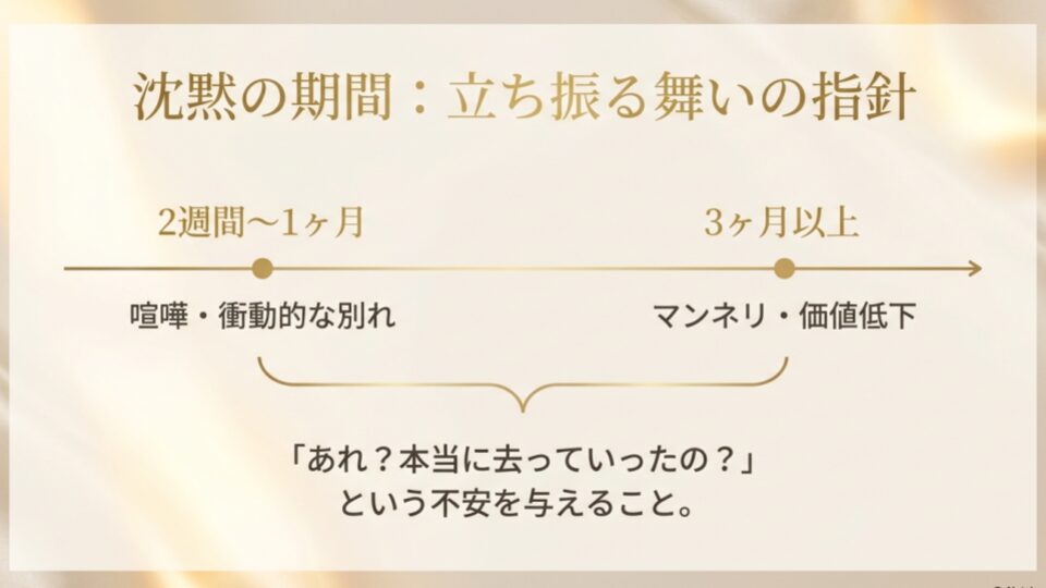 しかし、連絡を絶って数日から数週間。ふとした瞬間に訪れる「静寂」が、彼の心にじわじわと浸食していきます。映画のクライマックスで、一番いいところで画面が暗転して「続く」と出たら、気になって夜も眠れませんよね?沈黙とは、まさにその「暗転」なのです。