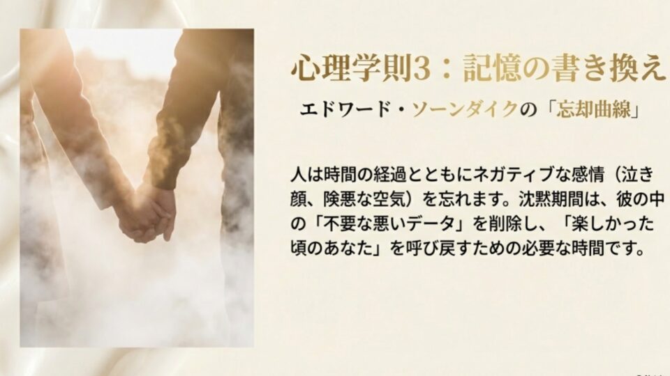 大丈夫。あなたが静かに息を潜めている間、心理学という名の味方が、彼の心に魔法をかけ続けてくれます。