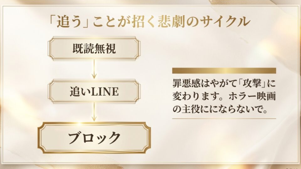 返信がないのに追加でメッセージを送る「追いLINE」。これは、相手にとって心理的な暴力に近いストレスを与えます。一度「既読無視」という選択をした彼は、罪悪感を感じています。そこに追い打ちをかけると、罪悪感はやがて「怒り」や「恐怖」に変わります。