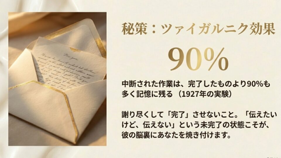 あなたが連絡をして、自分の気持ちをすべて話しきり、謝り尽くしてしまったら……。彼にとって「あなたとの関係」は完全に終わった「完了タスク」になってしまいます。「伝えたいことがあるけれど、伝えない」という未完了の状態こそが、彼の脳裏にあなたを焼き付ける秘策なのです。