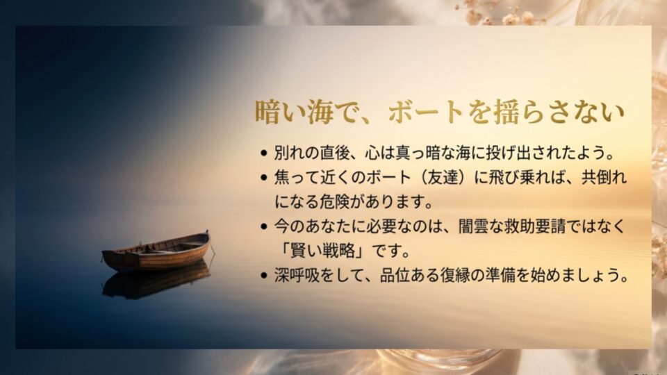 今のあなたは、真っ暗な海に投げ出されたような状態。焦って近くのボート(友達)に飛び乗ろうとすると、そのボートまでひっくり返ってしまうかもしれません。