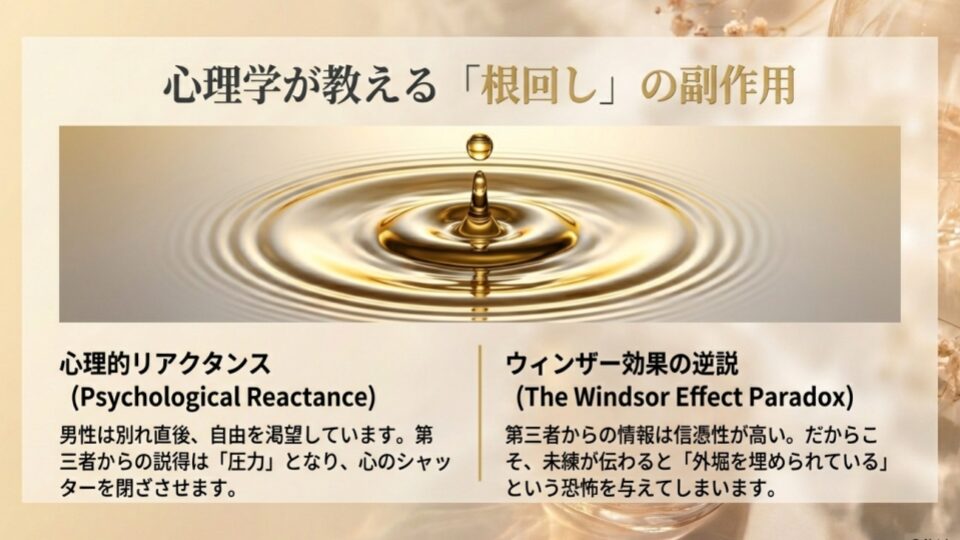 「ウィンザー効果」という心理的効果をご存知でしょうか。直接伝えられるよりも、第三者から聞いた情報のほうが信頼性が増すという効果です。これがポジティブに働けば良いのですが、振った直後の彼に対しては逆効果になります。