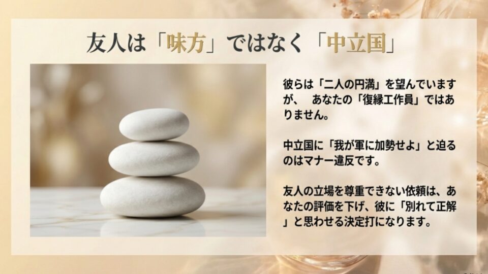 厳しいことを言うようですが、共通の友達はあなたのエージェントではありません。彼らは「二人の円満な関係」を望んでいるだけで、あなたの「復縁」を第一優先にしているわけではないのです。不偏不党の中立国に、いきなり「我が軍に加勢せよ」と言っても無理がありますよね。彼らの立場を尊重できない執拗な依頼は、結果としてあなたの評価を下げ、彼に「やっぱり別れて正解だった」と思わせる決定打になりかねません。