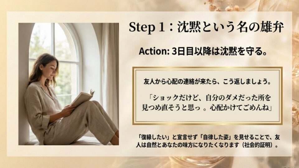 別れて3日目。今は何も言わないのが正解です。もし友達から「大丈夫?」と連絡が来たら、こう返してください。「正直まだショックだけど、自分のダメだったところを見つめ直そうと思ってるよ。心配かけてごめんね」これだけで十分です。