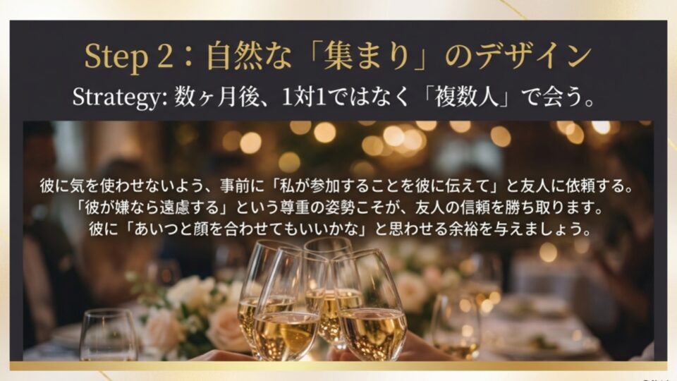 1対1の仲介を頼むのではなく、数ヶ月後に「みんなで集まる機会」を作ってもらう。これが最も安全なルートです。友達には「まだ気まずい思いをさせちゃうかもしれないから、彼には私が行くことを事前に言っておいてほしい。もし彼が嫌なら、私は遠慮するから」と。この「彼の意向を尊重する姿勢」こそが、友達の信頼を勝ち取ります。