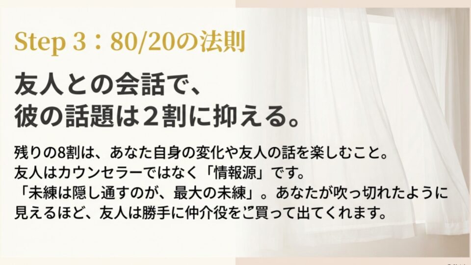 もし友達と会う機会があったら、彼の話をするのは全体の2割程度に抑えましょう。残りの8割は、友達自身の話を聞き、自分の変化を話すことに使ってください。そして、さりげなく「最近、みんなで集まった時、彼は楽しそうだった?」とだけ聞く。「彼、元気そうだったよ」という答えが返ってきたら、「よかった」と一言だけ言って微笑む。