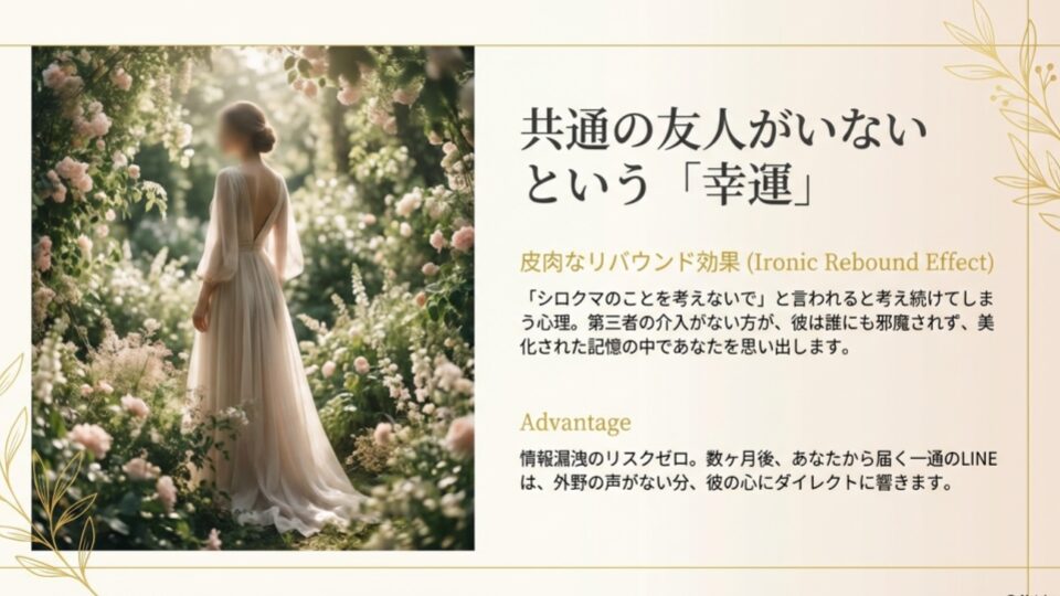 恋愛は本来、二人だけのプライベートな領域です。外野の声がないからこそ、あなたから送る数ヶ月ぶりの一通のLINEが、彼の心にダイレクトに響くこともあります。「共通の友達がいない=情報漏洩のリスクがない」とポジティブに捉えましょう。あなたは自分のペースで、自分磨きに集中すればいい。