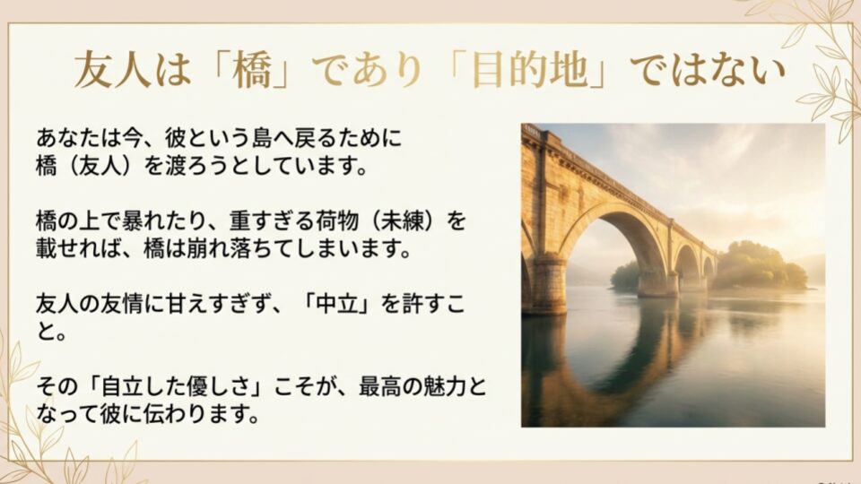 ここまで読んで、少しだけ心が落ち着きましたか?今のあなたは、彼という島へ帰るために、必死で橋(友達)を渡ろうとしています。でも、橋の上で暴れたり、叫んだりしてはいけません。橋が壊れたら、二度と彼の島へは辿り着けなくなるからです。