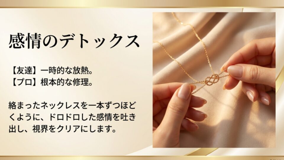 (ちなみに、友達に3時間愚痴を言ってスッキリするのは「一時的な放熱」ですが、カウンセリングは「不具合の根本修理」のような違いがあります。どちらも大切ですけれどね。)