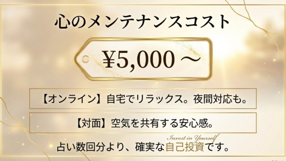 1回(45〜60分)あたり、5,000円〜15,000円程度が一般的です。オンラインのチャット相談であれば、月額定額制やより安価なプランもあります。ご自身の予算や、どれくらいの頻度で相談したいかに合わせて、無理のない範囲で選ぶことが大切です。