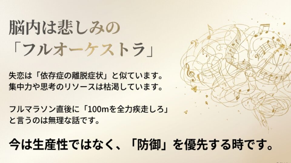心理学的には、失恋は「依存症の離脱症状」と酷似していると言われています。脳内で失恋の悲しみがフルオーケストラのように大音量で鳴り響き、仕事に必要な「集中力」や「思考のリソース」をすべて使い果たしている状態です。