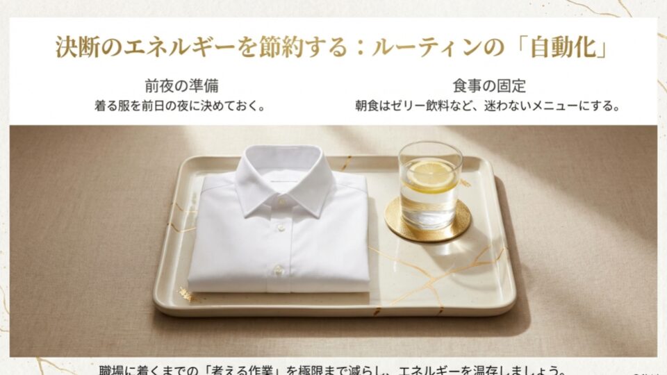 極限まで頭を使わない工夫をしてください。明日の朝、どの服を着るか、お昼に何を食べるか。そんな小さな決断ですら、今のあなたには重荷です。