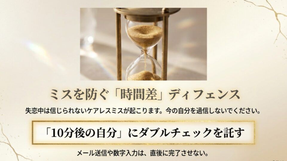「自分は今、使い物にならない」という前提で動いてください。メールの送信、数字の入力。すべて「10分後に読み直す」という自分ルールを作ってください。脳内のオーケストラが少し静まった一瞬の隙をついて、ミスを潰すのです。