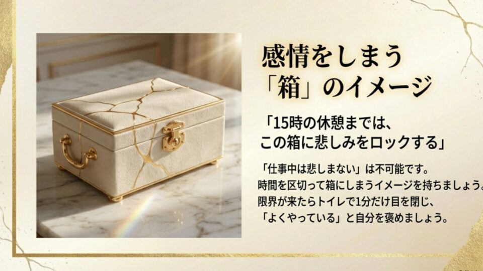 「仕事中は悲しまない」と決めるのは不可能です。でも、「15時の休憩までは、この箱の中に悲しみをしまっておこう」と、脳内でイメージするだけで、集中力の持続時間は変わります。