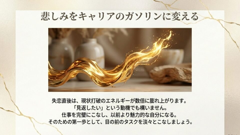 ある研究(被験者数数百名規模の社会調査)によると、失恋直後の人間は、現状を打破しようとするエネルギーが平常時の数倍にまで膨れ上がることが分かっています。この破壊的なエネルギーを、自分を傷つける方向ではなく、仕事の結果に変えていくのです。