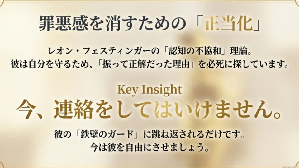 心理学者レオン・フェスティンガーが提唱した「認知の不協和」という理論があります。自分の行動(振ったこと)と感情(申し訳ない)に矛盾があると、人は脳を守るために、「振って正解だった理由」を必死に探し始めるのです。