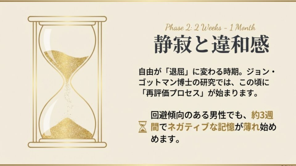 沈黙が2週間を超えると、彼の心に異変が起き始めます。あんなに欲しがっていた自由が、少しずつ「退屈」に変わり始める時期です。