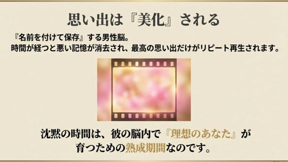 この時期、彼はあなたの「悪い部分」を忘れ、脳が勝手に「最高の思い出」をリピート再生するようになります。男性の保存形式が「別名保存」と言われるのは、このためです。