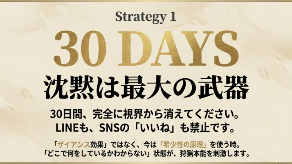 まずは30日間、彼の視界から消えてください。LINE、電話はもちろん、SNSの「いいね」も厳禁です。