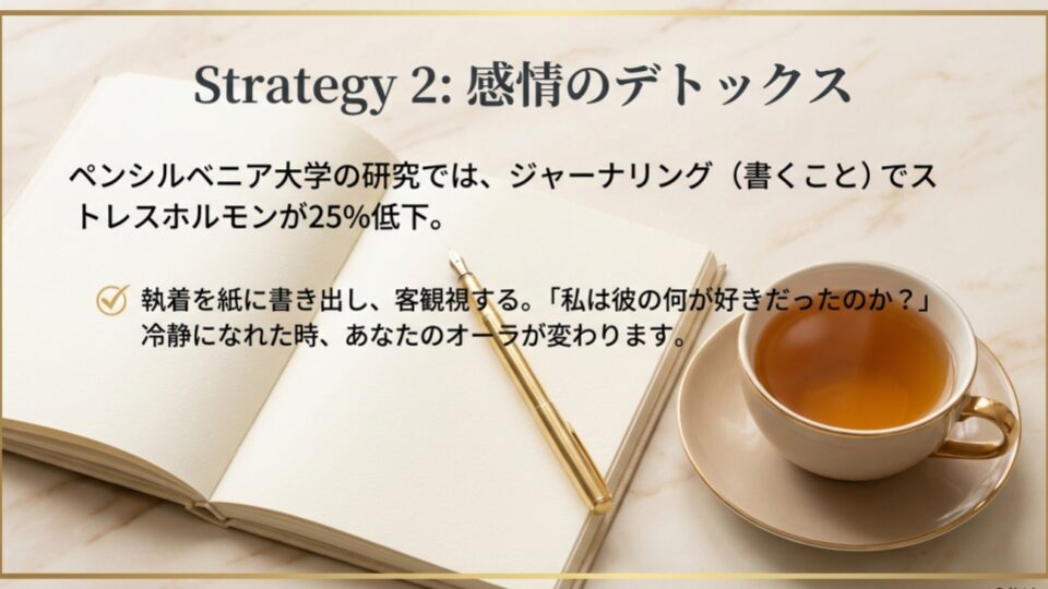 ペンシルベニア大学の研究では、失恋の痛みを「ジャーナリング(紙に書き出すこと)」した被験者は、そうでないグループよりもストレスホルモンの値が25%低下し、立ち直りが早かったという結果が出ています。
